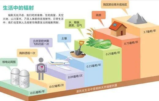 核電站醫(yī)院的放射科有電離輻射,我們生活中也有輻射。全世界的人的本底輻射劑量是2.4mSv/人,本底輻射:宇宙射線、天然放射性核素發(fā)出的射線、宇宙射線的強(qiáng)度隨海拔高度的增加而增大,高原地區(qū)的人群受到的宇宙射線照射劑量比平原地區(qū)的人群高,宇宙射線的強(qiáng)度在對(duì)流層上大約10公里處最強(qiáng)。需要我們指出的是:適當(dāng)?shù)奶烊挥行д丈鋵?duì)人體是有益的。